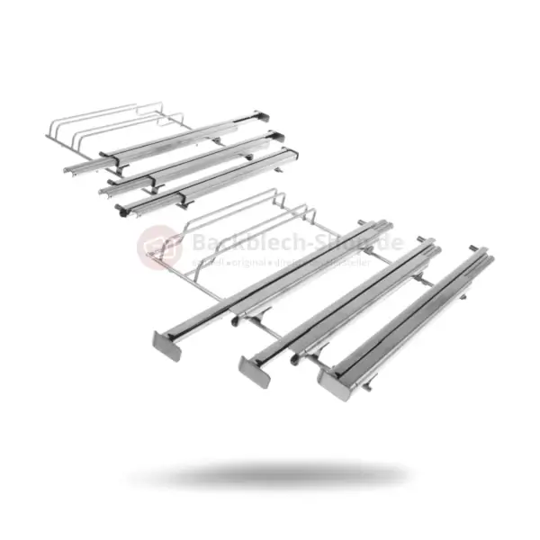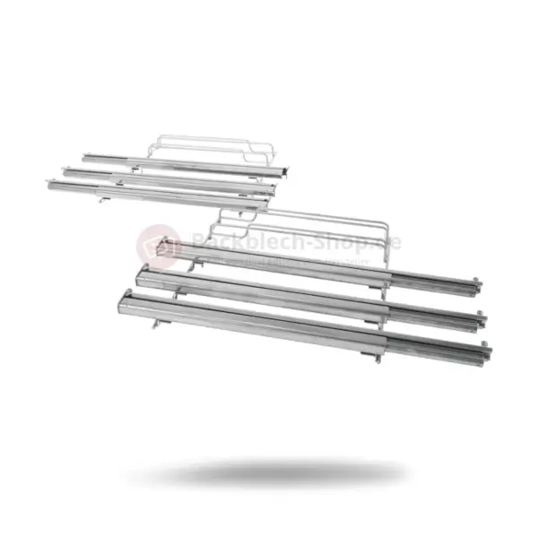 - Mit den Teleskopschienen auf den Ebenen 1, 2 und 3 kann das Zubehör ohne Umkippen aus dem Ofen herausgezogen werden